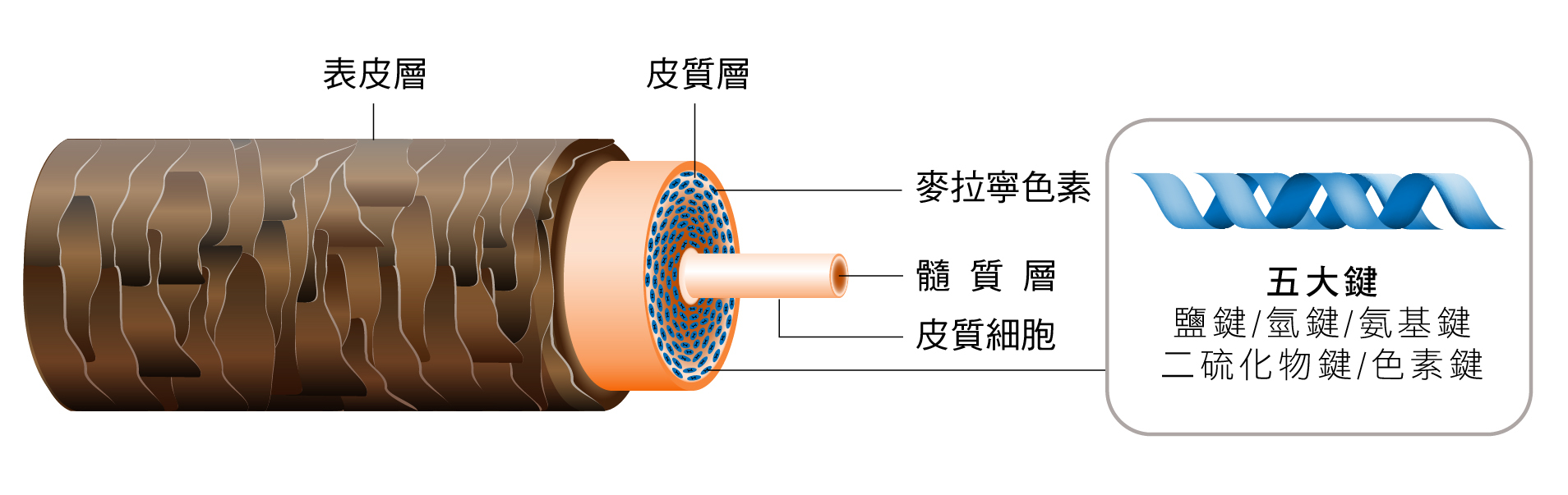 皮質層(毛皮質) 占毛髮85-90%的重要部分,由螺旋狀蛋白質纖維體形成的頭髮所有營養物質都在這層當中(如油脂、蛋白質、銨基酸等)它決定了頭髮的彈性和張力,「五大鍵」也在這層當中,鏈鍵組織的數量較多形成粗髮,較少的量形成細髮,所以毛髮的粗硬、細軟最大決定性因素是在於皮質層。