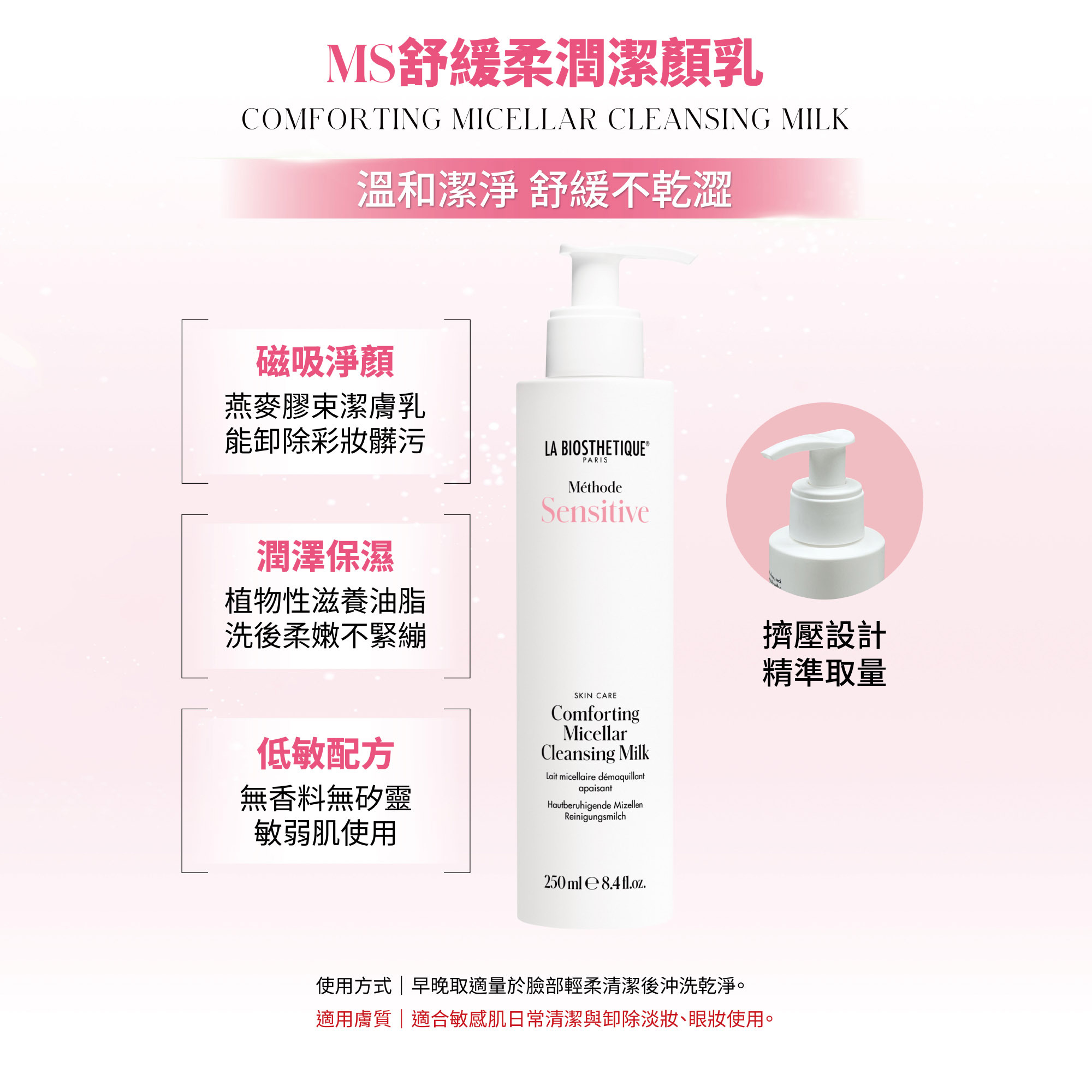 適合敏感肌日常清潔與卸除淡妝、眼妝使用。