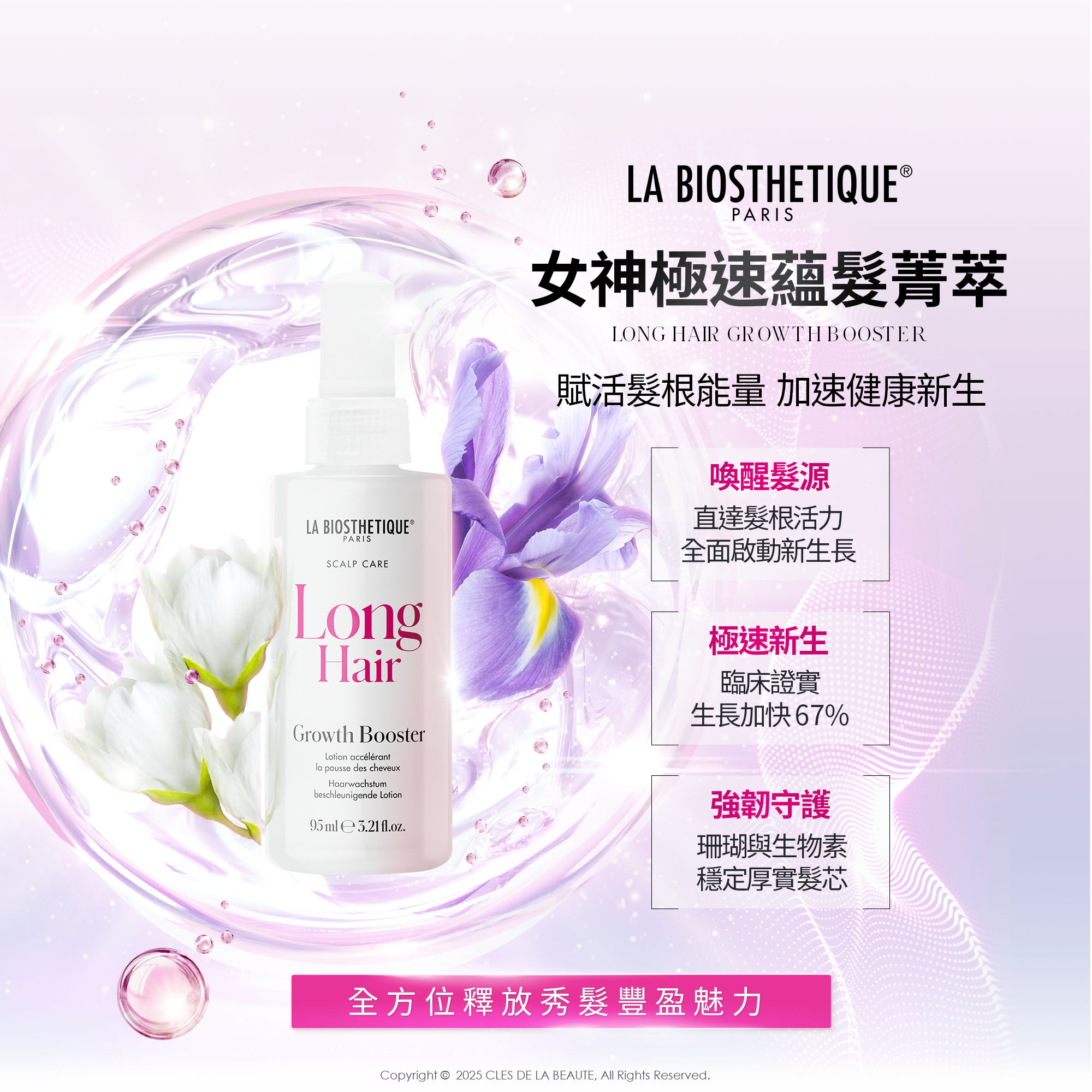 一瓶專為髮根與頭皮設計的能量菁萃,啟動髮絲生長關鍵源頭。高效活性配方深入頭皮底層,激活毛髮生成細胞,促進健康、強韌的新生髮絲生長,讓秀髮重現豐盈與生命力。