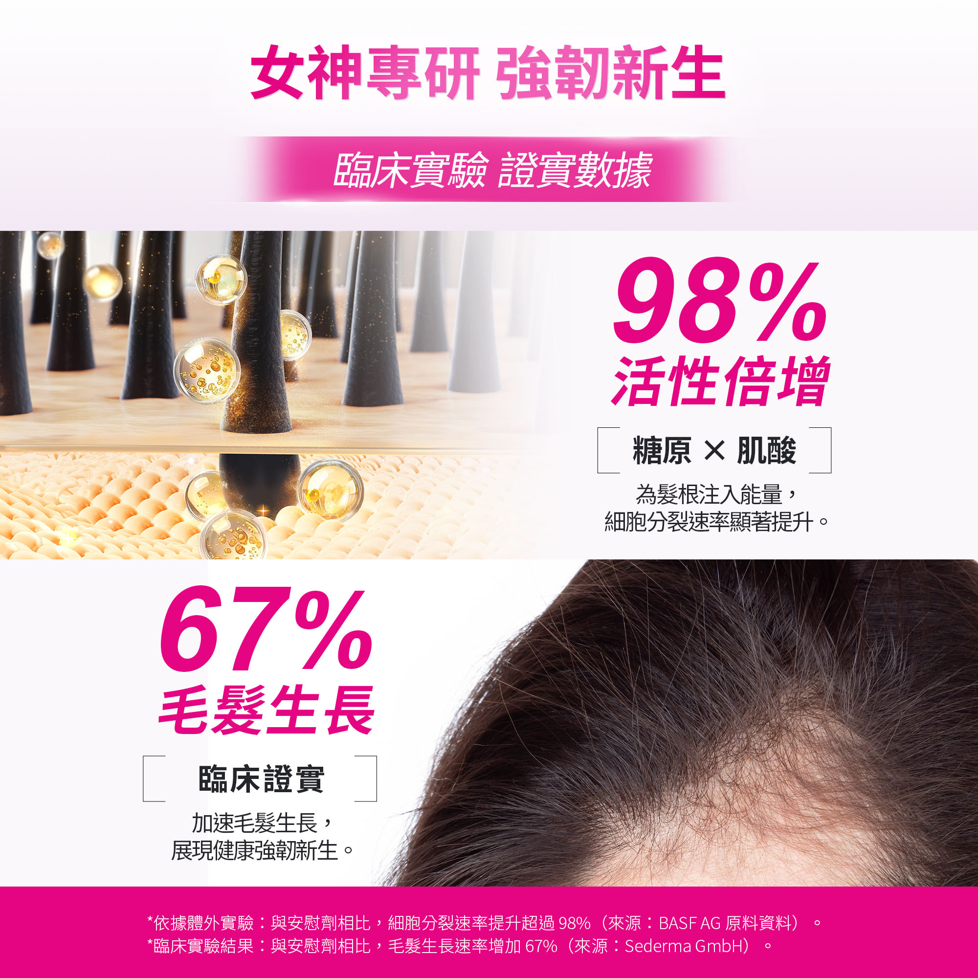 科研實證:臨床研究證實,毛髮生長速度提升達67%,細胞活性提升近1倍。