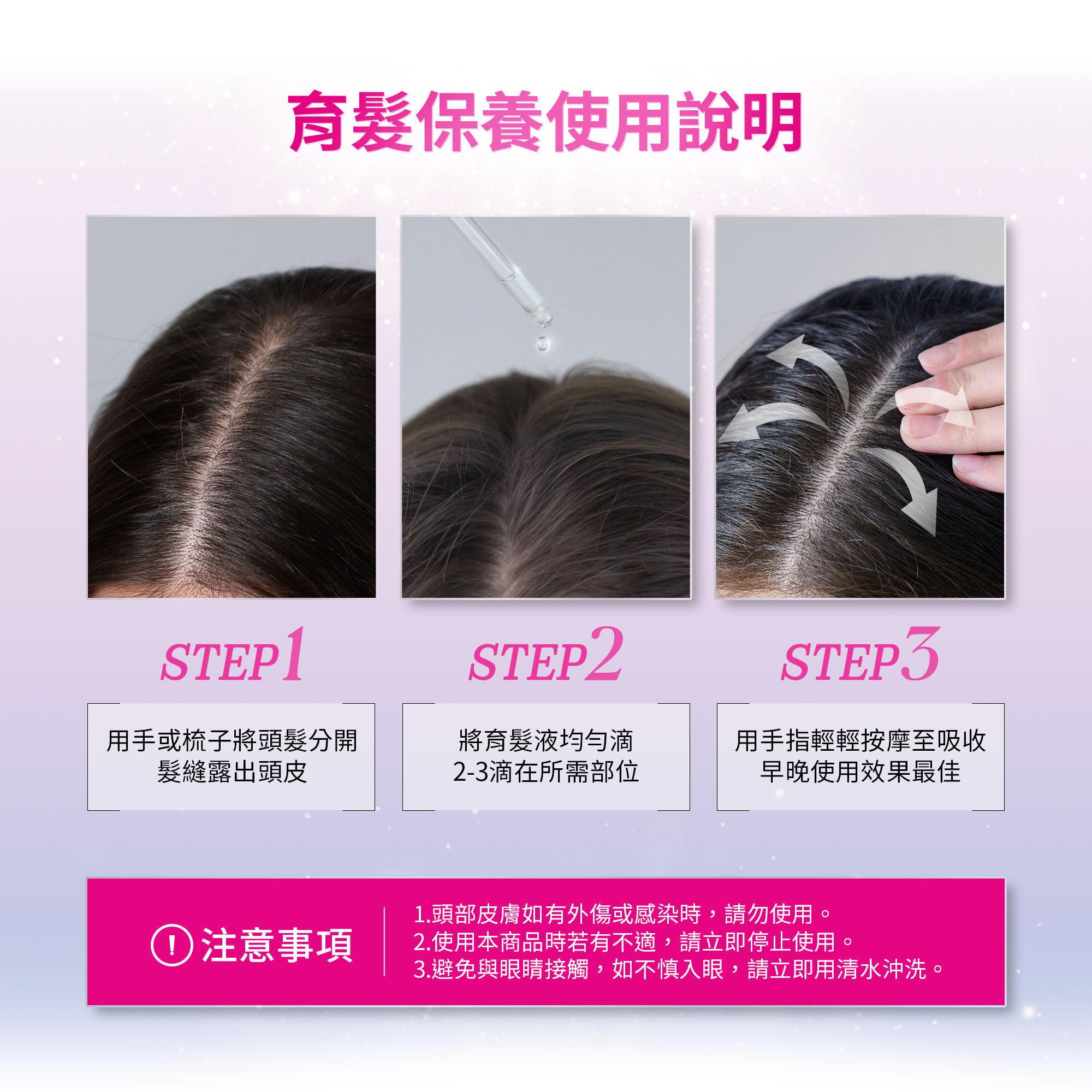 輕盈清爽:不黏膩水感質地,快速吸收於頭皮與髮根,清爽無負擔,每日使用也不厚重。