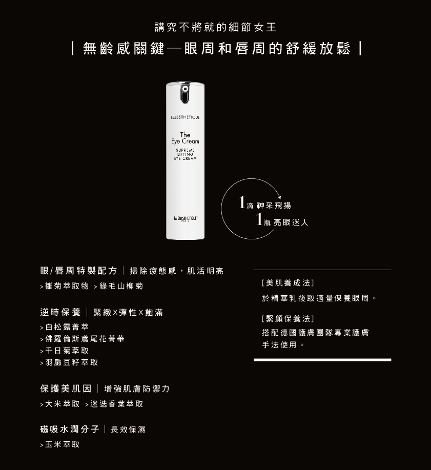 根據生物學博士的研究,眼周和唇周肌膚延緩老化的保養祕訣為『保濕』、『舒緩』、『放鬆』3大效能一次修護到位。