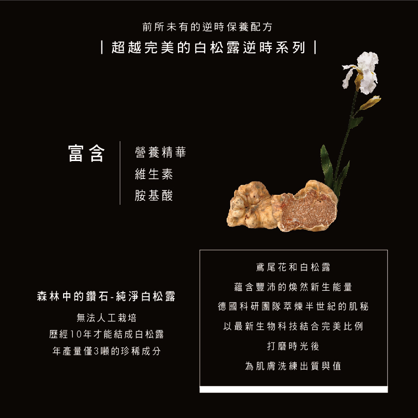 逆齡肌秘來自奢華的植物成分力量:白松露、佛羅倫斯鳶尾花、千日菊、白羽扇豆籽等高營養乳霜成分能有效全面修復肌膚。