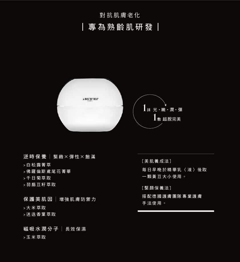 【抗老秘訣】:做為晚霜使用,搭配按摩或厚敷效果更加乘。